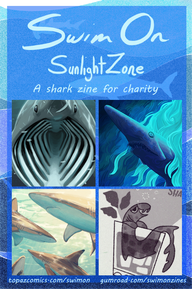All proceeds that this zine makes will be sent directly to sharksavers.org on a yearly basis. More info can be found at topazcomics.com/swimon
